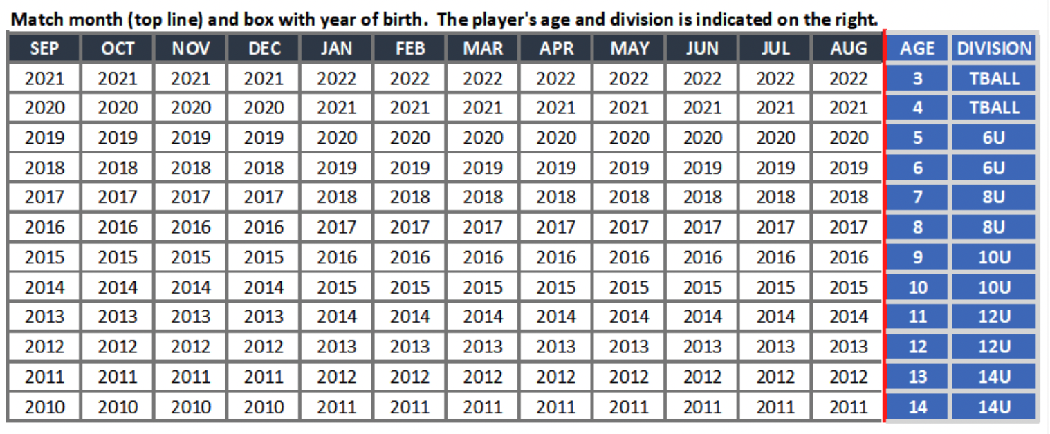Registration Flyer 2026.docx.pdfPlease note that the birth date has changed that determines the division that a player will play. Use the following chart to register for the correct age group. If your child falls into the 6u division, you should register for our Bitty Program.